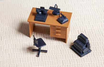 Office desk with swiveling chair, typewriter, table lamp, and telephone.