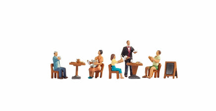 The set for the H0 scale (scale 1:87, approximately 2 cm high) includes five guests, a waiter, two tables, four chairs and a display board.